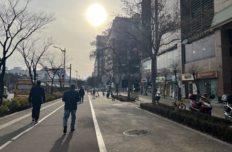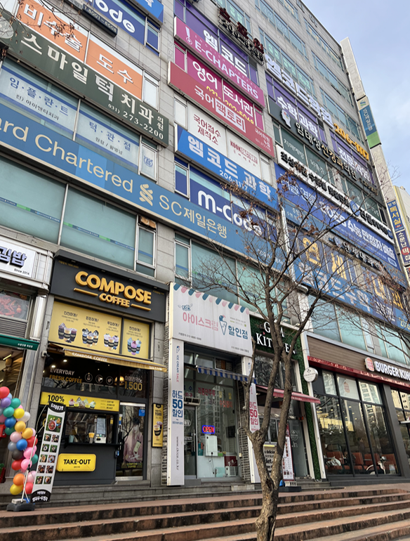 그리고 영통역 윗쪽으로 청명역 가기 전에 학원가들과 식당 상권이 있어요. 노란 학원 버스들이 잔득 서 있고, 자전거를 타고 가는 초중등 아이들도 많이 보였습니다.